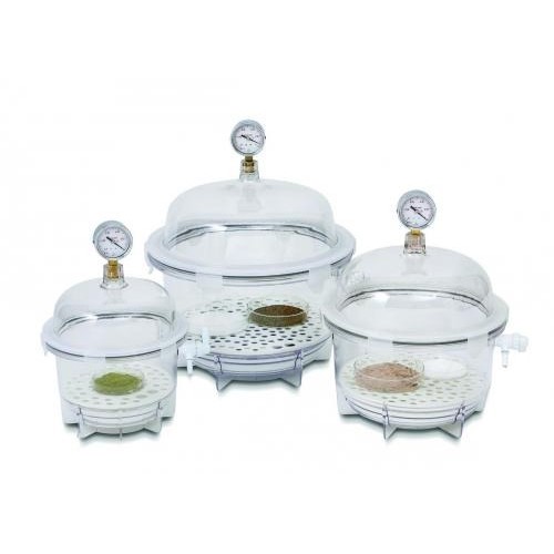 Stanowią tańszą alternatywę do szklanych eksykatorów, wysoce przezroczyste, lekkie, nietłukące, wykonane z poliwęglanu. Z uszczelką silikonową typu O-ring i specjalnym klipsem zamykającym, który umożliwia pracę bez konieczności stosowania smarów. Klamra na kołnierzu spina korpus i pokrywę eksykatora podczas pracy pod próżnią. Zawór trójdrogowy zapewnia wygodę podczas uwalniania próżni lub wymiany gazowej (np. na gaz obojętny). Próżnia maksymalna 1,3 mbar (1,33´10-4 MPa) przez ponad 72 godziny. Szeroka podstawa zapewnia doskonałą stabilność.