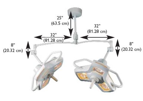 Gdy któraś z żarówek się wypali, dwie pozostałe będą nadal świecić sprawiając, że zabieg może być kontynuowany bez jakichkolwiek przeszkód. Lampa dostępna jest w wersji stojącej, do montażu na ścianie oraz pojedyncze lub podwójne modele z montażem na suficie. Zalecana odległość pomiędzy lampą a pacjentem wynosi od 0.6 do 1 metra. Odczepiany uchwyt (który również służy za kontrolę w ustawianiu ostrości światła) jest odpowiedni do autoklawowania i przyjmuje formę sterylnej pokrywy. Niewielki skrzyżowany przekrój lampy jest zaprojektowany dla minimalnych ingerencji w przepływ światła. Solidna i trwała konstrukcja zapewnia wieloletnie i profesjonalne oświetlenie.