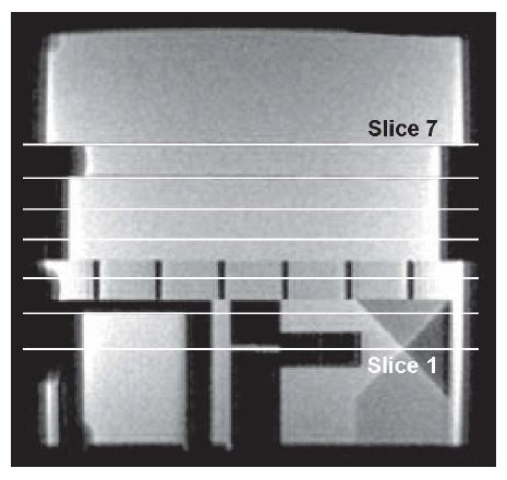 Na rysunku 1 przedstawiono lokalizator z siedmioma osiowymi lokalizacjami warstw. W prawym dolnym końcu płaszczyzny fantomu znajduje się para skrzyżowanych klinów 45º. Warstwa 1 jest wycentrowana na wierzchołku kąta utworzonego przez skrzyżowane kliny.