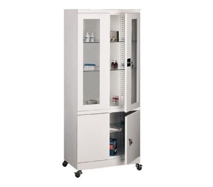Korpus szafy wykonany z blachy gr. 0,8 mm. Drzwi szafy przeszklone, półki wykonane ze szkła, przestawne co 25 mm. Uchwyt drzwiowy z zamkiem zabezpieczającym ryglującym drzwi w dwóch punktach. Szafa posiada kółka. Dolna półka zabudowana - drzwi wykonane z blachy. Kółka zamontowane do szafy umożliwiają łatwe przemieszczanie.