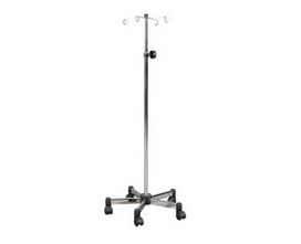 Stojak do płynów infuzyjnych WMK wykonany w całości z blachy kwasoodpornej. Podstawa pięcioramienna, część górna wyposażona w 4 haki wykonane z prętów kwasoodpornych.