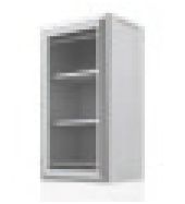 Szafka zamknięta z dwoma półkami i szklanymi drzwiczkami. Ścianki boczne specjalnie dostosowane do pojemników ISO.