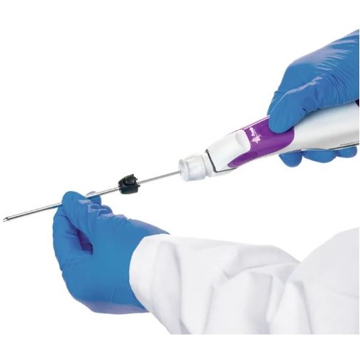 Ostro zakończona igła bez trudu zagłębia się w gęstej tkance piersi, ułatwiając dostęp do zmian chorobowych podczas każdego zabiegu.