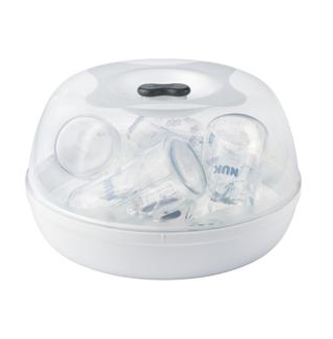 mieści do 4 butelek szerokootworowych, o pojemności 300 ml wraz z akcesoriami, które wysterylizuje w ciągu 4 minut, w zestawie ze szczypcami do butelek do higienicznego wyjmowania. Nadaje się do typowych kuchenek mikrofalowych ( mocy 500-1000 W), o następujących minimalnych wymiarach: 187 mm (wys) x 280mm (szer i gł).
