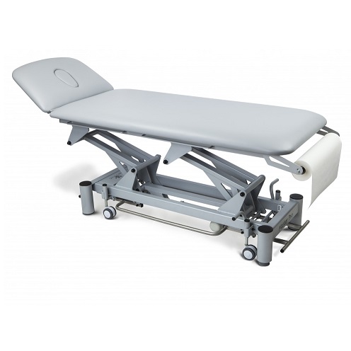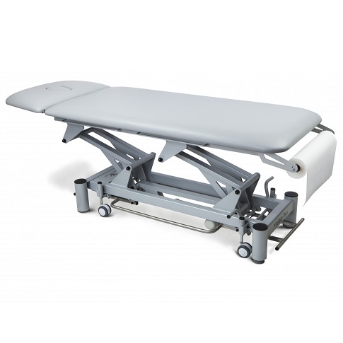 Stół do rehabilitacji 2 cz. Master PRO charakteryzuje się stabilną, metalową konstrukcją malowaną proszkowo. Stół regulowany jest przy pomocy siłownika elektronicznego sterowanego pilotem ręcznym. Stół 2 cz. występuje także w konfiguracji z siłownikiem hydraulicznym regulowanym przy pomocy kilkukrotnego naciśnięcia stopą dźwigni znajdującej się przy siłowniku. W standardzie zastosowano dwuczęściowe leże z otworem na twarz i zatyczką w podgłówku. Regulacja podgłówka odbywa się poprzez sprężynę gazową.