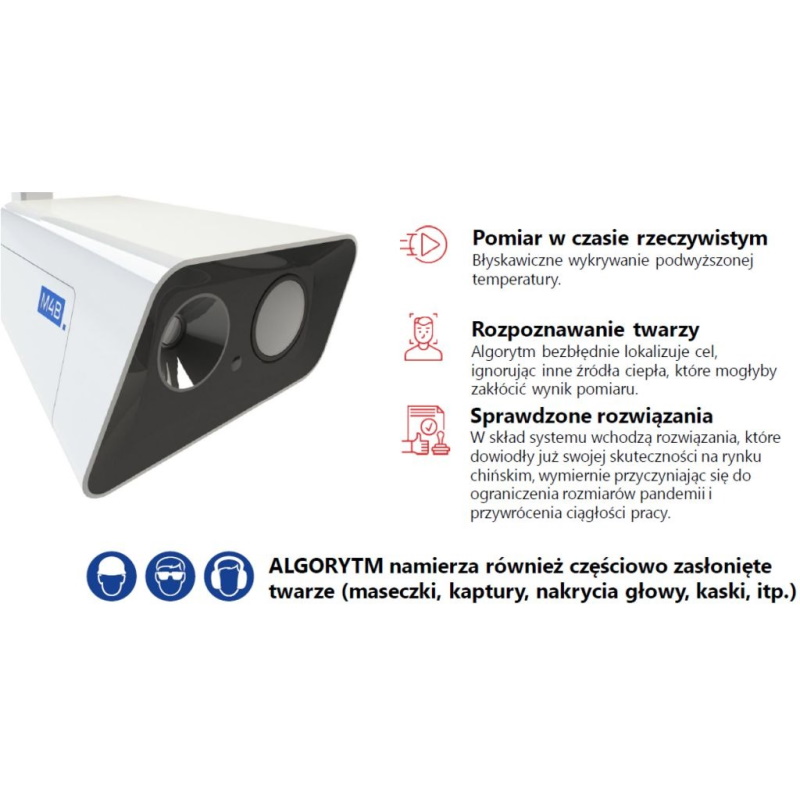 Uniwersalny zestaw składający się z kamery termowizyjnej, urządzenia kalibrującego oraz specjalnego oprogramowania służącego do zarządzania całym systemem. Algorytm namierza również częściowo zasłonięte twarze (maseczki, kaptury, nakrycia głowy, kaski. Pomaga monitorować ryzyko infekcji i chronić zdrowie pracowników i klientów. Świetnie sprawdzi się w średnich zakładach pracy, szkołach, szpitalach, urzędach i sklepach.
