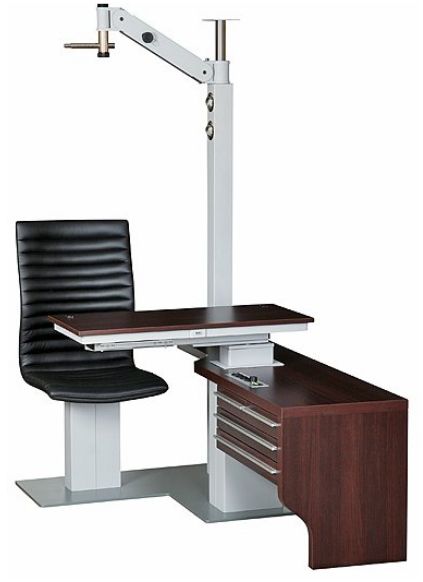 Unit okulistyczny: podnoszony, obrotowy i przesuwany blat na dwa urządzenia; mechanizm umożliwiający blokadę blatu; urządzenia włączane automatycznie po przesunięciu blatu; kolumna ze zintegrowanym oświetleniem; zintegrowany panel do sterowania wysokością blatu; regulacja natężenia oświetlenia lampy szczelinowej; półka pod rzutnik optotypów; szafka z dwoma szufladami. Wyposażenie dodatkowe: rozkładany fotel (mechanicznie); ramię foroptera.