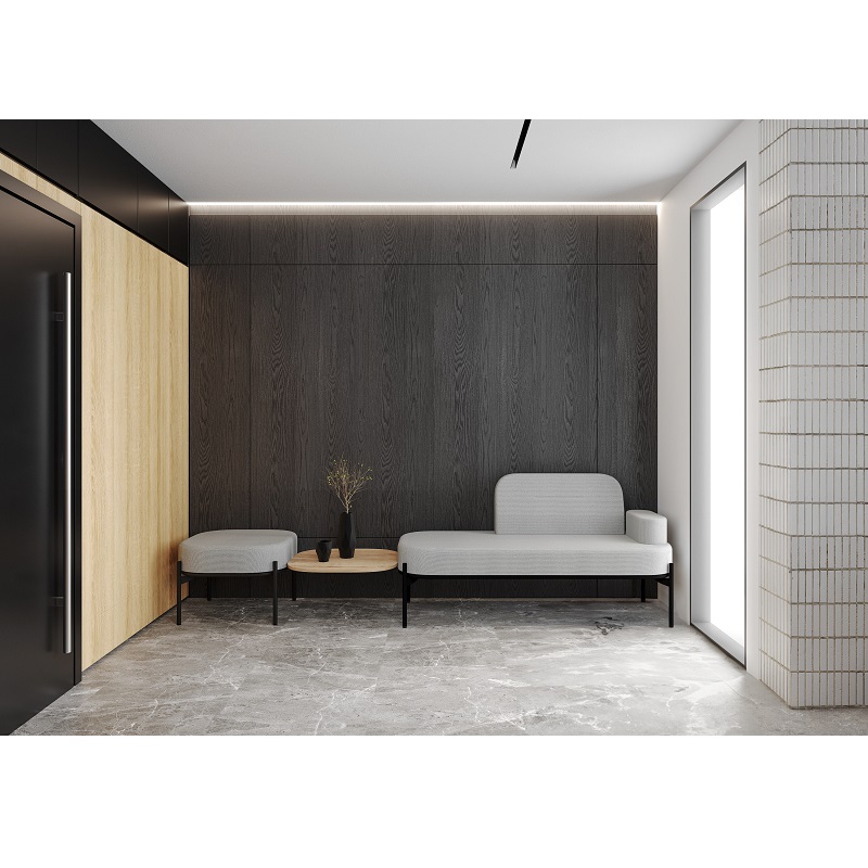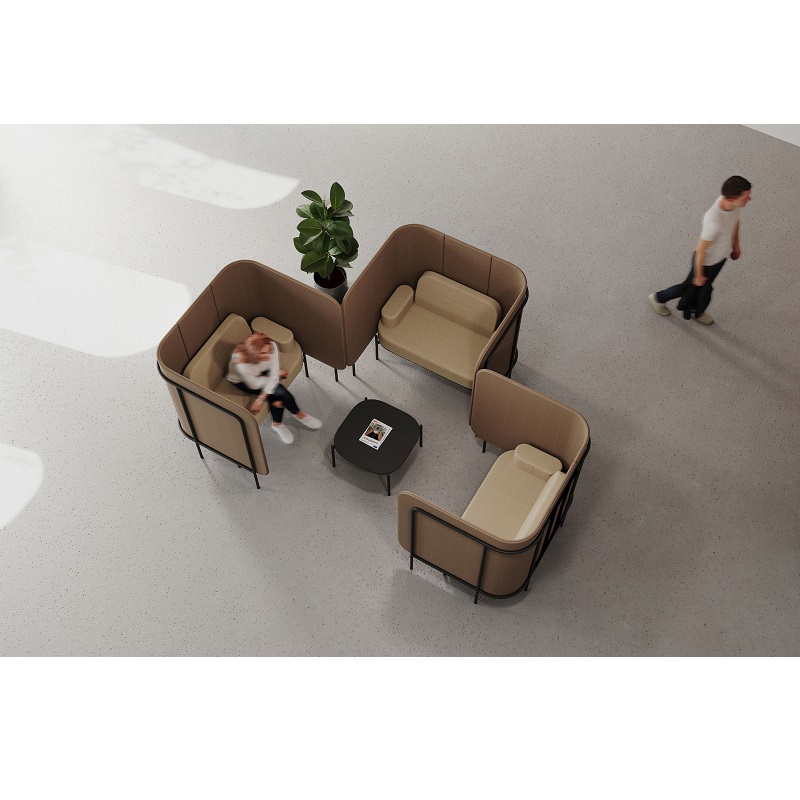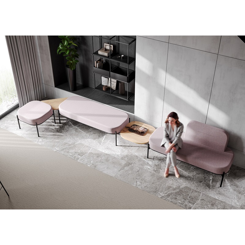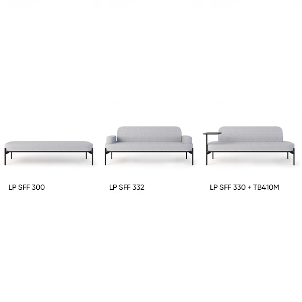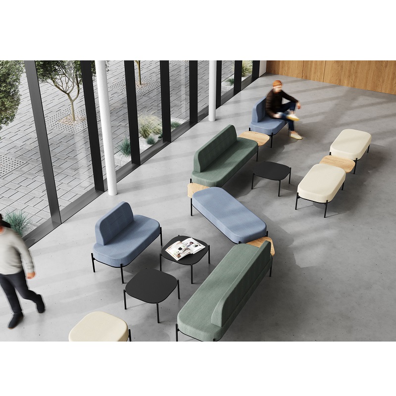 Wszystkie konstrukcyjne elementy stalowe są lakierowane i dostępne w 3 kolorach RAL, podobnie jak funkcjonalne akcesoria które wzbogacają funkcjonalnie całą kolekcję. Cokoły sof i zaślepki nóżek opcjonalnie mogą być wykonane z drewna jesionowego w różnych wybarwieniach . Stoliki lub blaty łączące stanowią funkcjonalny dodatek do sof; z możliwością zamówienia z mediaportem.