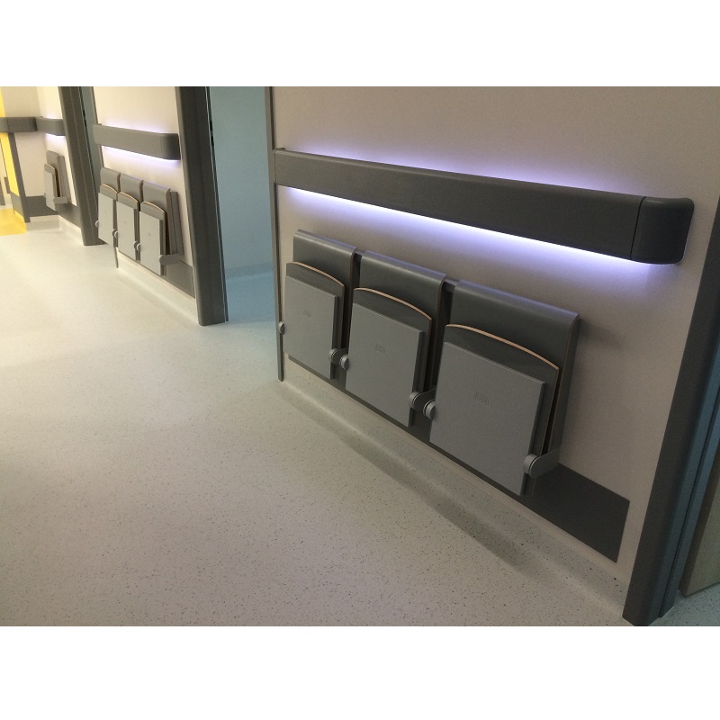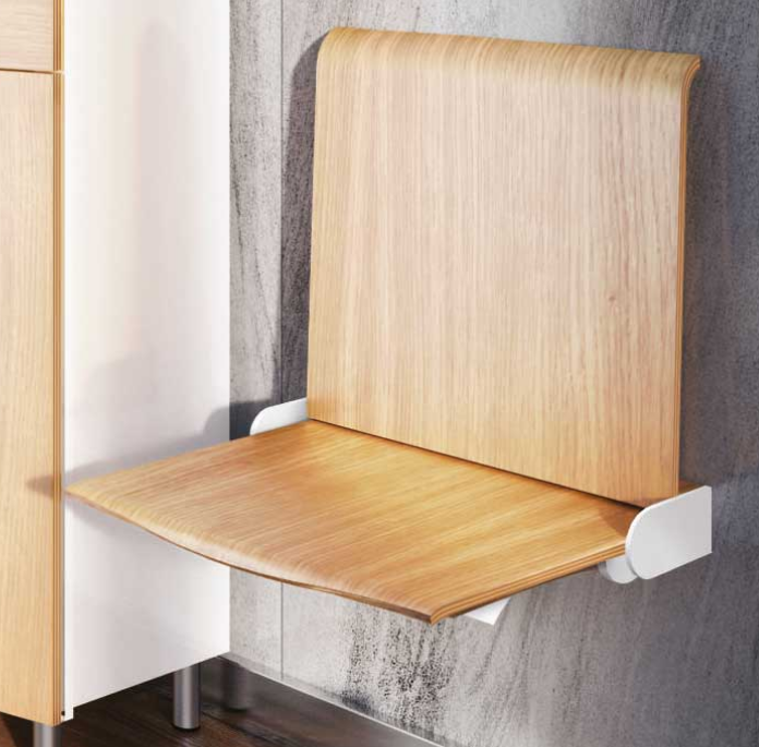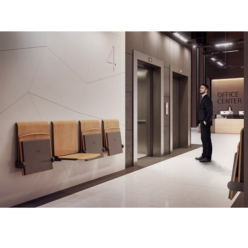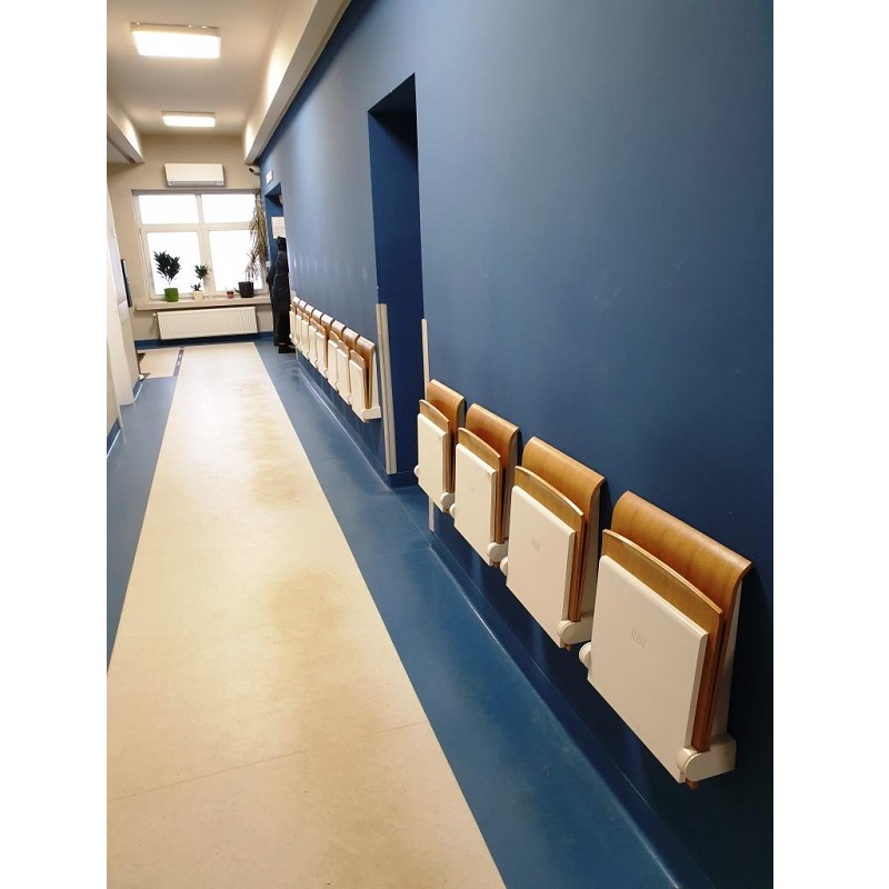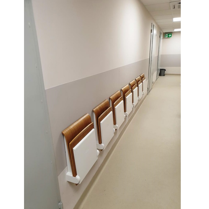 Rozkładane siedziska naścienne są bardzo praktycznym elementem wyposażenia w miejscach wymagających swobody komunikacyjnej, zajmując po złożeniu tylko 15 cm. Charakteryzują się łagodną, uniwersalną i jednocześnie nowoczesną stylistyką wzorniczą. Siedzisko wykonane jest z formowanej sklejki wykończonej laminatem lub fornirem w kolorze naturalnego dębu. Krawędzie siedzisk są frezowane w sposób odsłaniający kolor drewna, co podkreśla prostotę formy i jej organiczną dekoracyjność. Stalowe elementy pokryte zostały lakierami proszkowymi. Siedziska mogą być wyposażone w automatyczny mechanizm powrotu do pozycji zamkniętej.