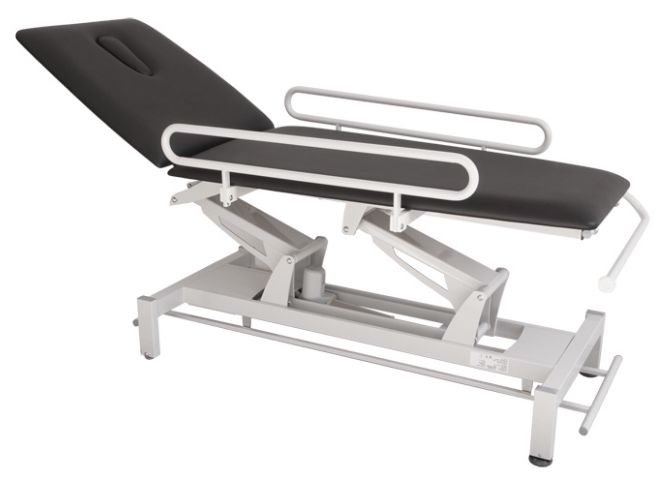 Stół do badań - dwusekcyjny (dostępne dwie wersje: Terapeuta E-S2.F0 i Terapeuta E-S2.F4) jest to stół na ramie z elektryczną regulacją wysokości przeznaczony do prowadzenia badań diagnostycznych, które często wymagają od pacjenta niezbędnej, długotrwałej i właściwej pozycji. Cechy charakterystyczne: * stabilna konstrukcja, * elektryczna regulacja wysokości za pomocą przełącznika ramowego dostępnego z każdej strony stołu, * ustawianie kąta nachylenia poszczególnych części leżyska (zagłówek) za pomocą sprężyn gazowych, * zagłówek z wyprofilowanym otworem na nos i brodę oraz zaślepka otworu na twarz, * uchwyty do zamocowania pasa, * dostępny system jezdny: 2 małe kółka transportowe i 2 stopki lub 4 unoszone koła kierunkowe i 4 stopki, * bogaty osprzęt dodatkowy, * tapicerka wykonana jest z atestowanych materiałów w kilku wersjach kolorystycznych, * opuszczane barierki boczne, * grubość (gąbki) tapicerki stołu 40 mm (standard) lub 50 mm (opcja).