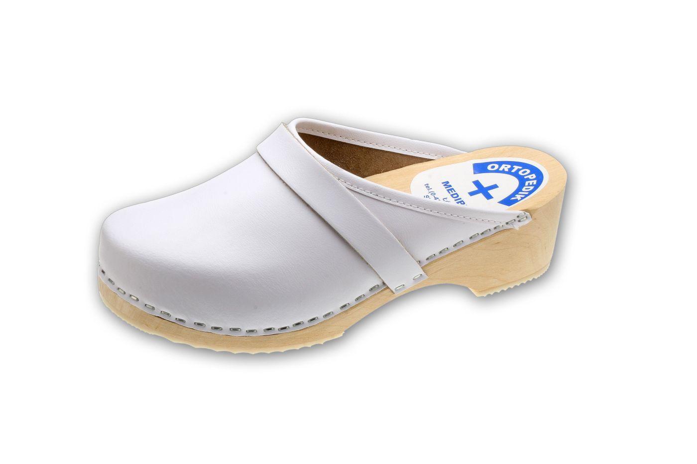 Pantolety zdrowotne (drewniaki) na spodach drewnianych z profilem ortopedycznym, podeszwą przeciwpoślizgową i cholewką skórzaną.