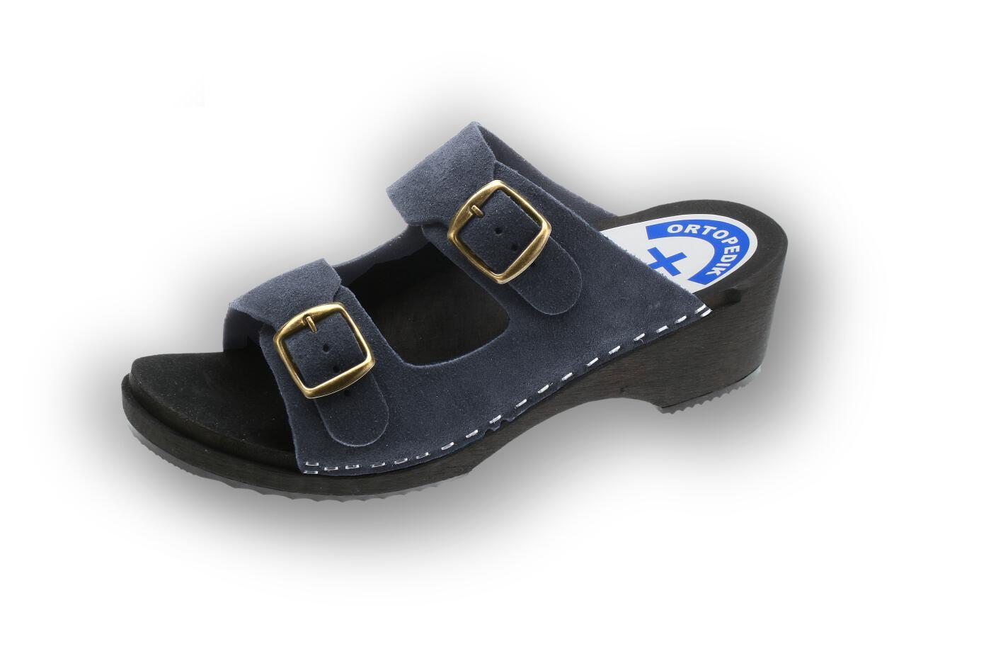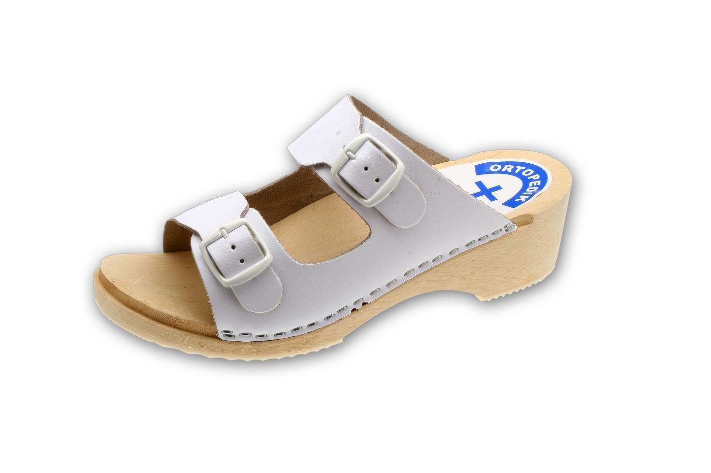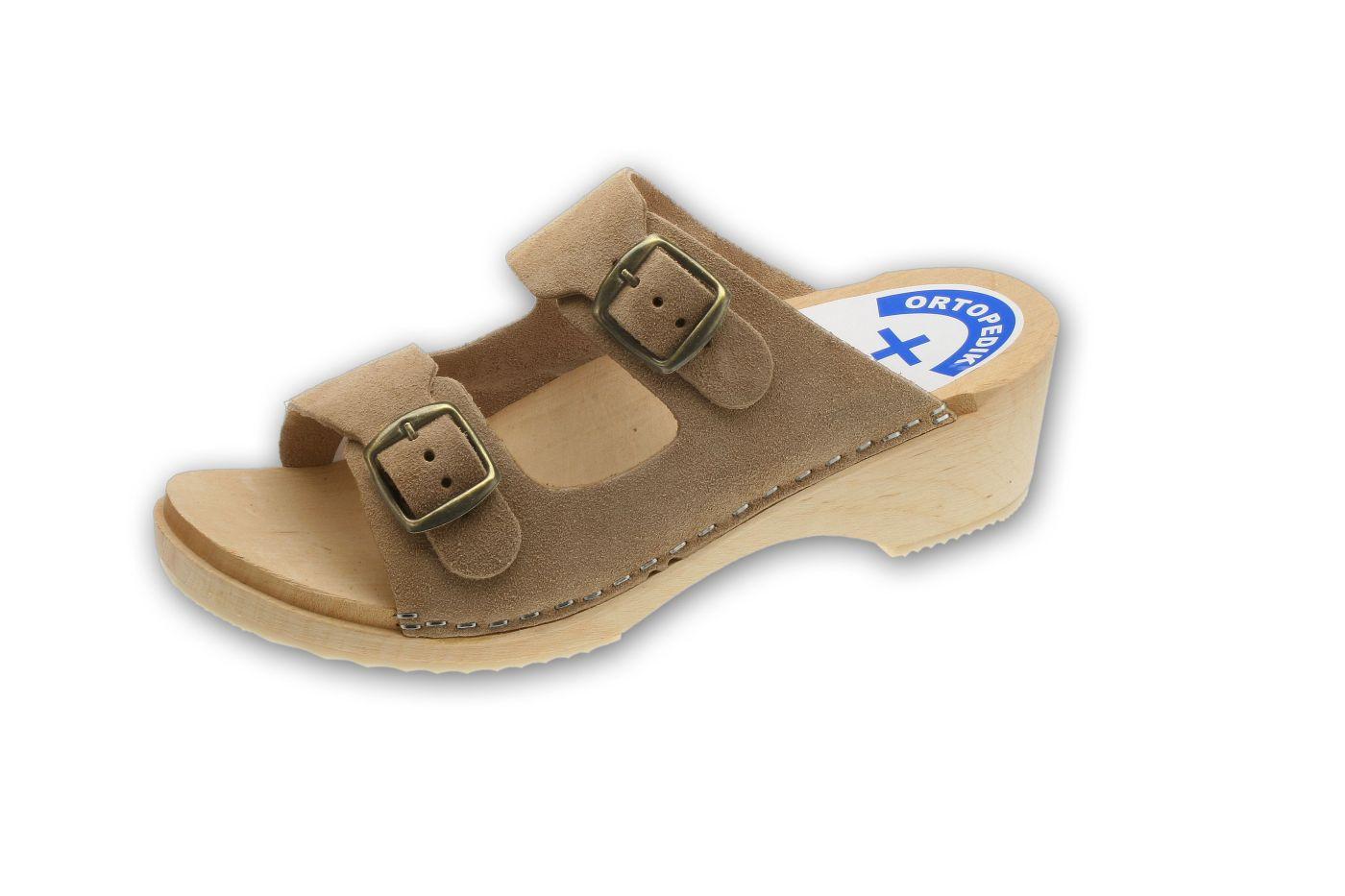 Pantolety zdrowotne (drewniaki) na spodach drewnianych z profilem ortopedycznym, podeszwą przeciwpoślizgową i cholewką skórzaną z regulacją tęgości. Cholewka z regulacją tęgości.