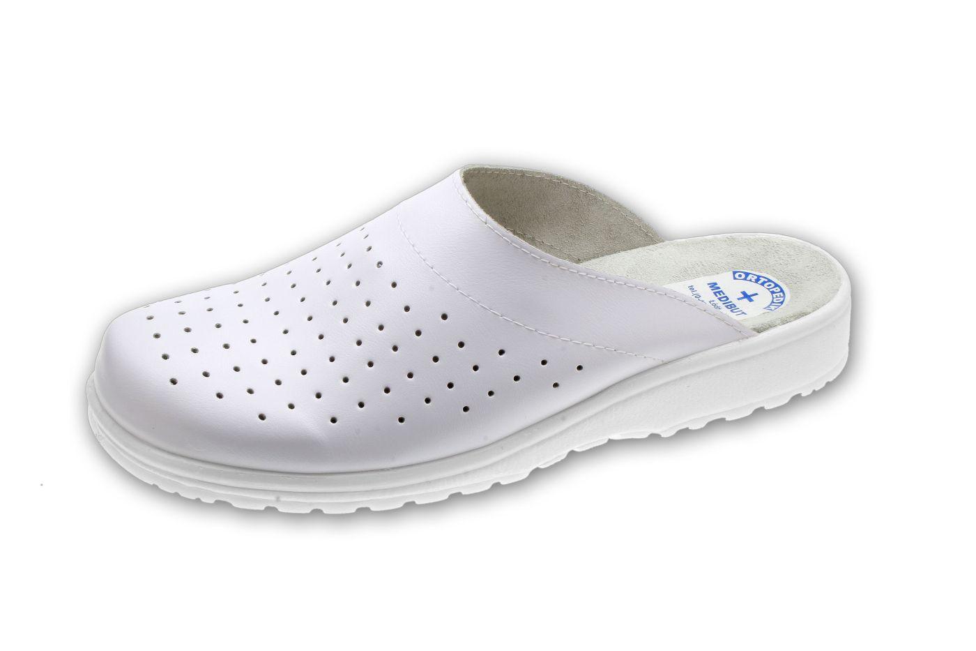 Obuwie damskie i męskie na spodach przeciwpoślizgowych z profilem ortopedycznym, cholewką i wyściółką skórzaną. Cholewka z perforacją.