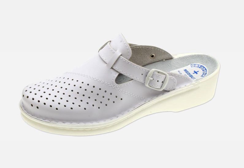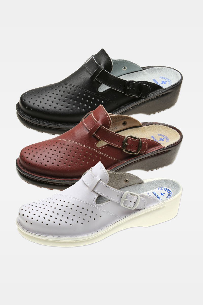 Obuwie damskie przeszywane, na spodach przeciwpoślizgowych z profilem ortopedycznym. Wyściółka i cholewka skórzana, możliwość regulacji tęgości. Cholewka z perforacją.