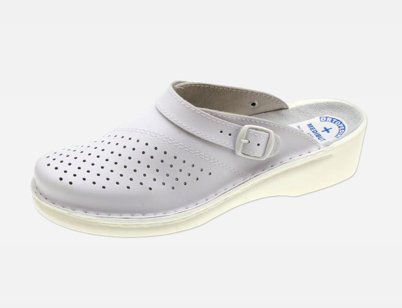Obuwie damskie przeszywane, na spodach przeciwpoślizgowych z profilem ortopedycznym. Wyściółka i cholewka skórzana. Pasek dwufunkcyjny przekładany na piętę, cholewka gładka lub z perforacją, bez regulacji tęgości.