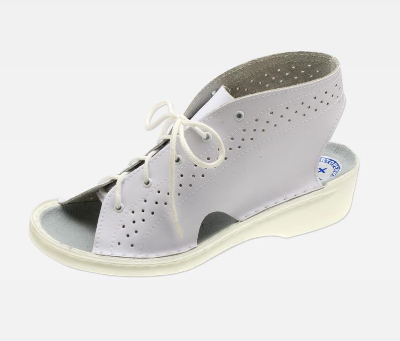 Obuwie damskie przeszywane, na spodach przeciwpoślizgowych z profilem ortopedycznym. Wyściółka i cholewka skórzana, możliwość regulacji tęgości. Obuwie damskie z podniesioną cholewką powyżej kostki, sznurowane. Tego typu obuwie usztywnia stopę i zabezpiecza ją przed skręceniem w kostce. Kolor: biały.