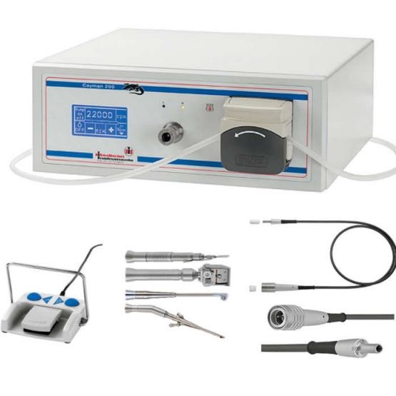 System silnikowy Cayman 200 z giętkim mikro-kablem przeznaczony do wyjątkowo długich zabiegów chirurgicznych wymagających zastosowania wysokich momentów obrotowych z wykorzystaniem: prostnic i mikropił.
