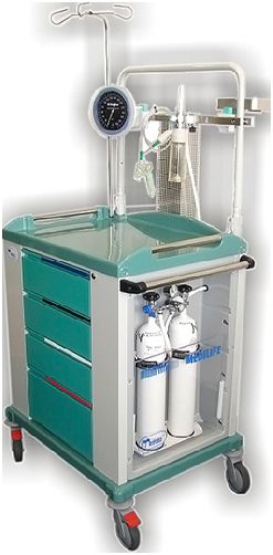 Wózek Reanimacyjny Medilife. Szkielet z ABS, wypełnienie stalowe. Blat roboczy plus dodatkowy, wysuwany blat. 4 przednie wysuwane szuflady. 3 boczne uchylne szuflady. Koła pokryte antystatyczną gumą wyposażone w hamulce. Wyposażenie opcjonalne: półka na defibrylator/monitor, wieszak na infuzję, akcesoria szynowe.