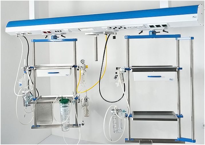 Zestaw posiada wewnętrzną instalację elektryczną oraz wewnętrzną instalację gazów medycznych wyprowadzone w miejscu montażu. Miejsca wejść instalacji elektrycznej i gazowej indywidualnie dopasowane do każdego z pomieszczeń szpitala. Wersja podstawowa przystosowana jest do montażu sufitowego. Standardowe długości dla 1 łóżka 2000mm, możliwość wykonania paneli do długości max 6000 mm.