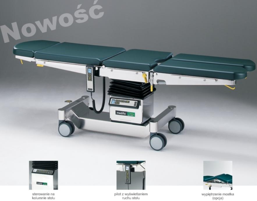 Stół przeznaczony jest do zabiegów i operacji w zakresie chirurgii ogólnej, w połączeniu z wyposażeniem specjalistycznym, do operacji i zabiegów proktologicznych, ginekologicznych, urologicznych, laryngologicznych, okulistycznych. Niska minimalna wysokość blatu umożliwia przeprowadzania długich operacji w wygodnej dla chirurga pozycji siedzącej. Maksymalny udźwig pacjenta wynosi 200 kg. Wszystkie elementy metalowe narażone na działanie czynników zewnętrznych wykonane są ze stali kwasoodpornej. Przejezdna podstawa stołu wyposażona jest w centralną blokadę kół z funkcją pozycjonowania stołu uruchamianą pedałem nożnym. Podstawowe ustawienia stołu tj. przechył boczny, przechył Trendelenburga i anty-Trendelenburga, regulacja segmentu pleców oraz zmiana wysokości realizowane są za pomocą układu elektro-mechanicznego zasilanego bateryjnie 24 V. Wszystkie wymienione funkcje uruchamiane są z pilota przewodowego i z równorzędnego panelu sterowania umieszczonego na kolumnie nośnej stołu - oba z dodatkowym ekranem LCD wyświetlającym realizowane funkcje. Zmiana kąta nachylenia podnóżków i podgłówka wspomagane są sprężynami gazowymi z blokadą i realizowane ręcznie. Dla łatwiejszej i szybszej obsługi przez personel medyczny oznaczono na żółto wszelkie dźwignie do regulacji stołu. Opcjonalnie stół może być wyposażony w takie funkcje jak: wypiętrzenie mostka czy przesuw wzdłużny blatu. Standardowy blat stołu jest 4 segmentowy i wyposażony został w antystatyczne, bezszwowe materace w właściwościach przeciwodleżynowych. Segmenty blatu są przenikalne dla promieni RTG i umożliwiają wykonywanie zdjęć oraz monitorowanie ramieniem C w pełnym zakresie.