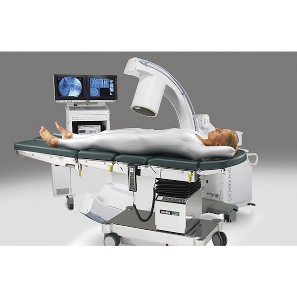 - Współpraca z ramieniem C na 100% długości stołu dzięki elektrycznemu przesuwowi wzdłużnemu oraz braku metalowych elementów / poprzeczek wspierających konstrukcję blatu.