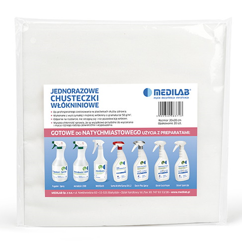 Jednorazowe chusteczki włókninowe do rozprowadzania preparatów dezynfekcyjnych po małych powierzchniach.