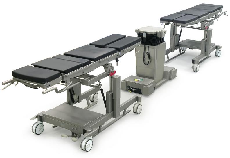 Stół operacyjny z systemem wymiennych blatów. Stół posiada elektrohydrauliczną regulację wysokości, przechyłów wzdłużnych i bocznych.