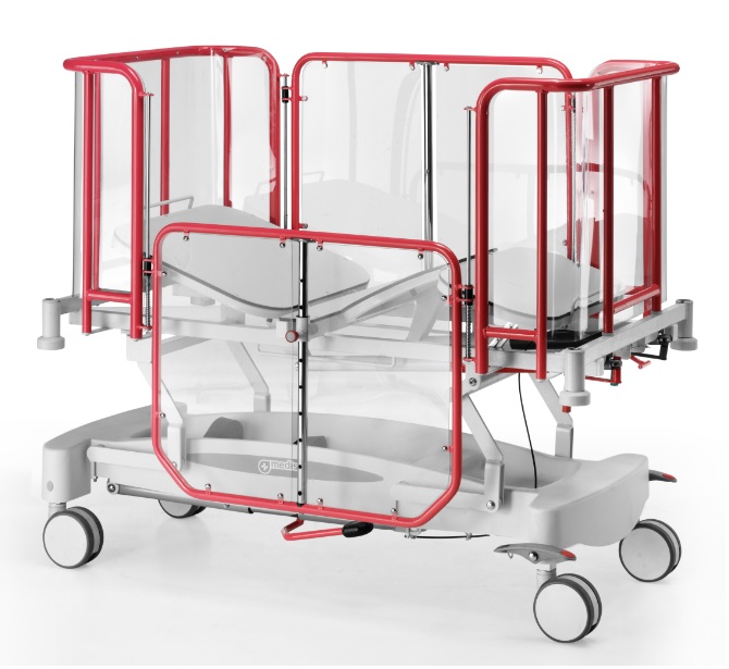 - Leże łóżeczka jest czterosegmentowe, wykonane z HPL dzięki czemu jest odporne na wilgoć, preparaty myjące i dezynfekcyjne oraz na uszkodzenia mechaniczne.