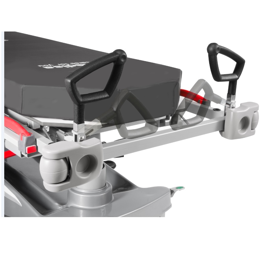 Uchwyty transportowe z możliwością złożenia na ramę wózka (od strony głowy) lub z możliwością demontażu (od strony nóg). Zintegrowany z konstrukcją, regulowany drążek infuzyjny.