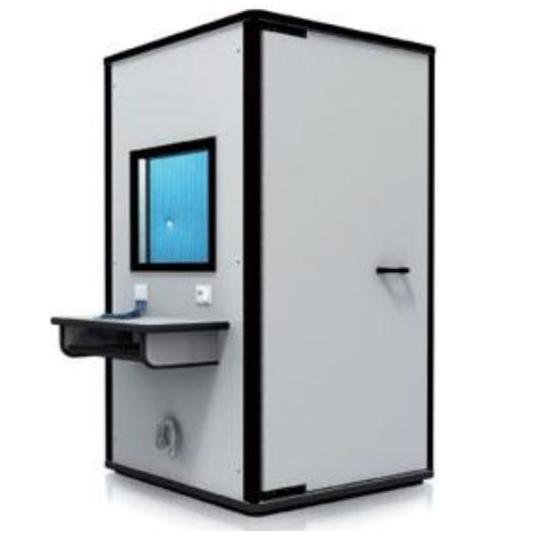 Kabina audiometryczna SR 100. Specyfikacja techniczna: metalowa obudowa (2mm), ściany odporne na porysowania i ognioodporne (25 mm), wnętrze wykonane z eleganckiego materiału, łatwego w czyszczeniu, wewnętrzna i zewnętrzna pianka, pochłaniająca gale dźwiękowe, drzwi posiadają otwarcie wewnątrz jak i na zewnątrz. Domykane magnetycznie. dźwiękoszczelne okno kabiny.