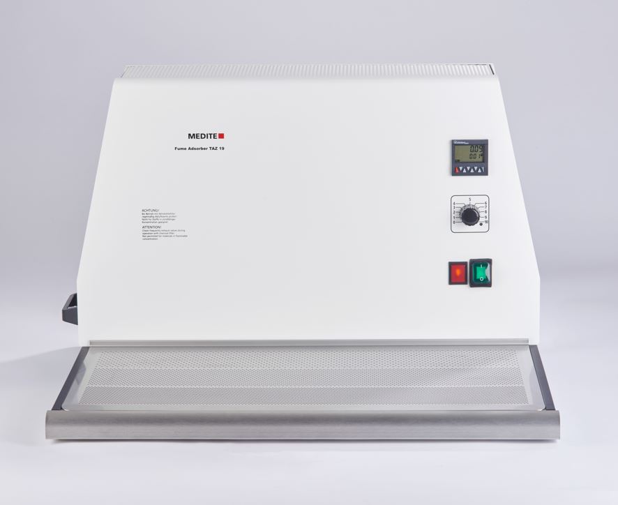 Wentylacja podpodłogowa jest idealna, ponieważ wiele oparów odczynników jest cięższych od powietrza. Urządzenie może być użytkowane samodzielnie z filtrem z węglem aktywnym lub z podłączeniem do istniejącego systemu powietrza wentylacyjnego. Aby jeszcze lepiej zapobiegać wydostawaniu się oparów z obszaru roboczego, do TAZ 19 można dodać opcjonalnie dostępny kaptur ze szkła akrylowego. Niezbędne zmiany filtra są sygnalizowane sygnałem optycznym.