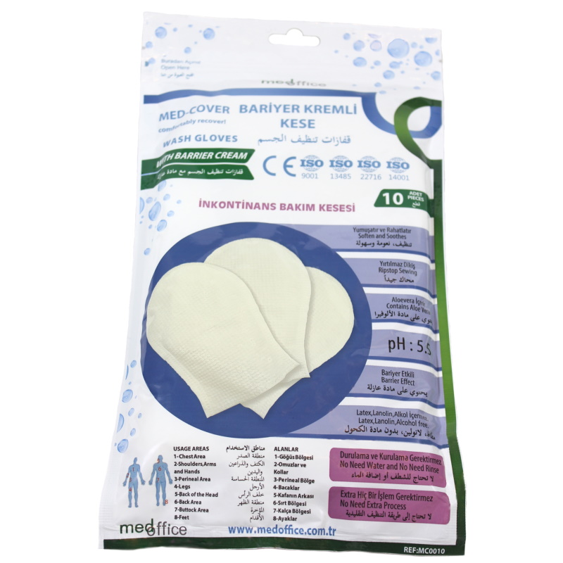 Duże, miękkie i grube myjki w formie rękawicy, zapewniające higieniczną pielęgnację skóry, nasączone środkami myjącymi i nawilżającymi. Zawierają delikatny, oczyszczający, odświeżający i nawilżający preparat, z dodatkowymi właściwościami ochronnymi skóry. Stosowane bezpośrednio po wyjęciu z opakowania do codziennych procedur mycia całego ciała pacjenta. Możliwość wcześniejszego podgrzania w mikrofalówce. Nie wymagają użycia dodatkowej wody. Testowane dermatologicznie. Przeznaczone do wszystkich rodzajów skóry. Opakowanie z możliwością wielokrotnego zamykania. Opakowanie zawiera 8 lub 10 myjek.