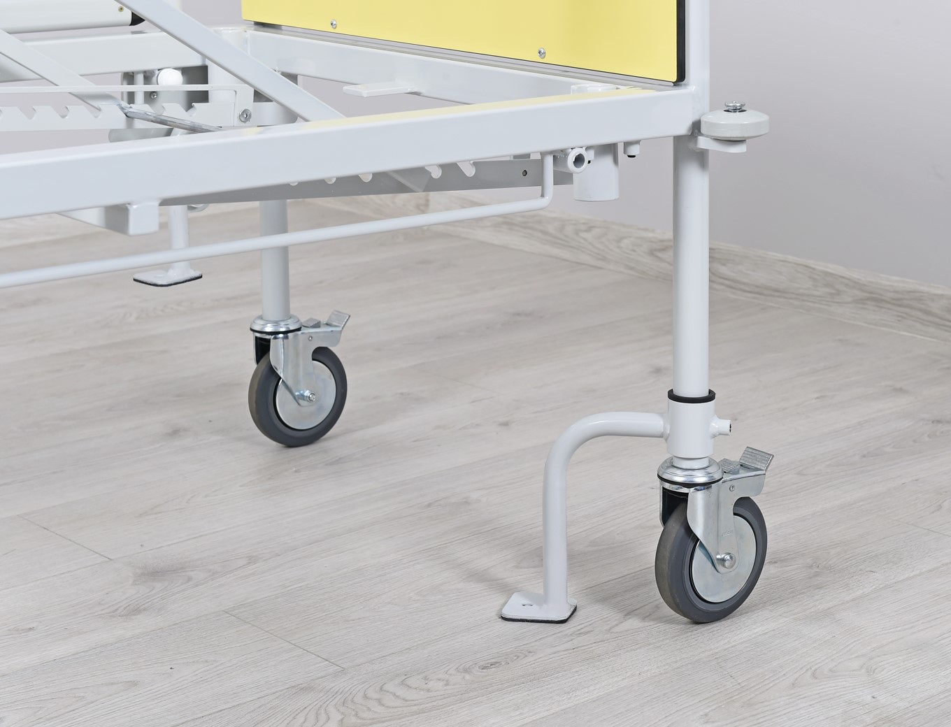 - wszystkie 4 nogi łóżka mogą być wyposażone w specjalny mechanizm umożliwiający przymocowanie łóżka do podłoża co zapewnia zwiększenie podparcia łóżka przeciwdziałając w ten sposób wywróceniu łóżka w przypadku leżenia na nim pacjentów nadpobudliwych lub agresywnych – podstawa stopki mechanizmu zabezpieczona przed rysowaniem powierzchni