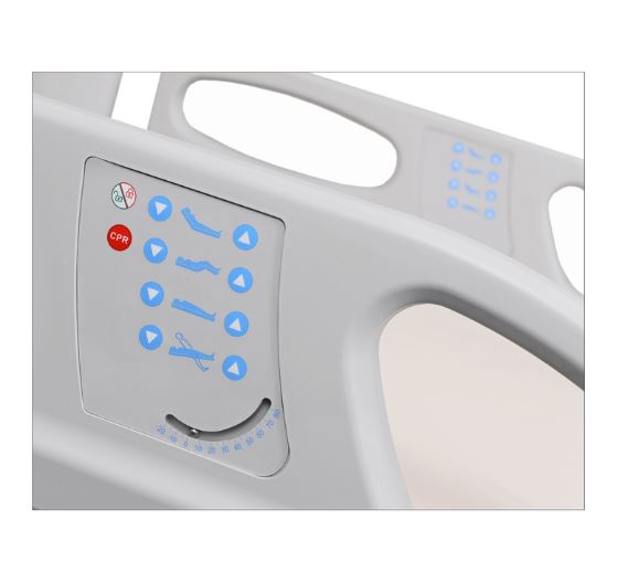 - barierki boczne - tworzywowe z wbudowanym panelem sterującym dla personelu zewnątrz dla pacjenta wewnątrz barierek. Możliwość wykonania łóżka bez paneli sterujących w barierkach.