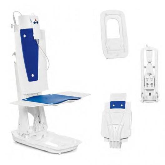 Podnośnik składa się z 3 części dla jego łatwego montażu i demontażu. Optymalne wymiary dla transportu i przechowywania i wyjątkowa stabilność konstrukcji przy niewielkim ciężarze własnym. Samonośne siedzisko i oparcie z wyprofilowaniem do ciała wykonane są z tworzywa sztucznego miłego w dotyku, przy czym jest ono antypoślizgowe, trwale i łatwe dla utrzymania w czystości. Poza tym oparcie ma regulację kąta nachylenia w najniższym położeniu.