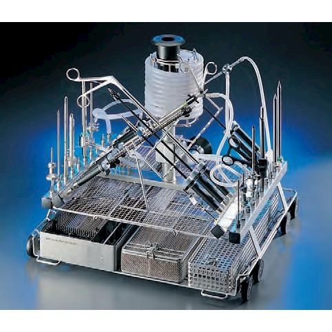 W celu mycia i przepłukiwania pustych w środku przyborów mikrochirurgicznych wózek iniekcyjny E 450/1 wyposażony jest w 40 możliwości podłaczenia. W dwóch rzędach po 10 połaczeń można w sumie umieścić ukośnie 20 przyborów/zewnętrznych trzonków. Połaczenia maja charakter wtykowy i można je szybko zmieniać. Po obydwu zewnętrznych stronach górnego poziomu wózka znajduja się 2 dalsze rzędy z 20 odkręcanymi połaczeniami w każdym
