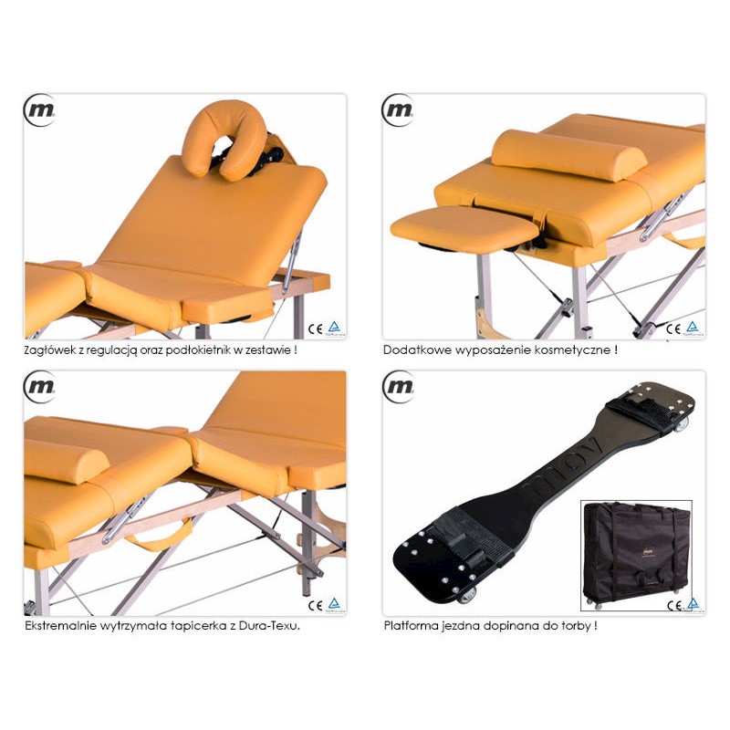 Stoły te zostały stworzone z myślą o masażystach poszukujących wytrzymałego, odpornego na bardzo częste rozkładanie i składanie, stabilnego i wygodnego stołu do wytężonej pracy. Dzięki zastosowaniu najnowszych cyfrowych technologii obróbki drewna uzyskaliśmy niepowtarzalne i jedyne w swoim rodzaju detale wykończeniowe. Każda z części składowych stołu wykonana jest z maksymalna precyzją, jest gładka, miła w dotyku, estetyczna i co najważniejsze bezpieczna. Nowoczesna technologia produkcji pozwala Nam na wykonanie produktu spełniającego najbardziej rygorystyczne normy, stabilnego, ekstremalnie wytrzymałego i bezkonkurencyjnego w swojej kategorii cenowej.