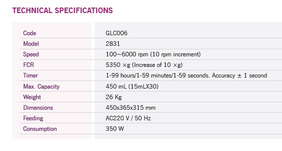 Niskoobrotowa wirówka o dużej pojemności GLC006 łączy w sobie zaawansowane funkcje, wysoką wszechstronność, możliwość stosowania zarówno wirników kątowych, jak i wychylnych, z maksymalną pojemnością do 450 ml (30x15 ml), specjalnie zaprojektowaną do stosowania probówek o pojemności 15 i 50 ml.