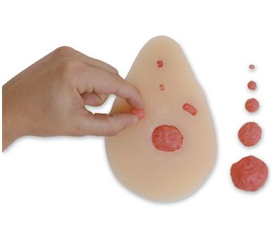 Edukacyjny model piersi dostarczany jest z pięcioma różnych rozmiarów guzkami , które mogą być wkładane i wyjmowane z piersi, co zapobiega zapętaniu miejsc umieszczenia guzków przez uczące się kobiety. Idealny do mammografii oraz nauki samokontroli piersi. Dostarczany ze specjalną walizeczką i dodatkowym zestawem guzków. Specyfikacja techniczna: masa 0,91 kg, dostarczany w walizce, dodatkowe wymienialne guzki.
