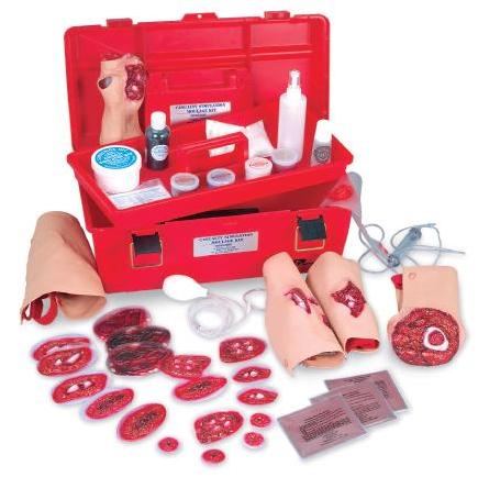 Podręczny zestaw zaprojektowany dla wszystkich poziomów szkolenia z zakresu pierwszej pomocy. Zawiera symulowane rany najczęściej występujących obrażeń i pozwala na edukację kursantów w zakresie rozpoznawania i prawidłowego traktowania tych ran w sytuacji awaryjnej. Zestaw zawiera 24 repliki poszczególnych złamań, nadżerek, i ran. Każda replika może być łatwo przymocowana do “ofiary.” Duży zapas poszczególnych materiałów do makijażu zapewni realizm w Twoich ćwiczeniach, a dołączone pięć przenośnych zbiorników z pompkami powoduje faktyczne “krwawienie” ran. Zestaw posiada wytrzymały futerał transportowy.