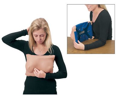 Model piersi przeznaczony jest do nauki prawidłowej techniki badania piersi, zarówno dla studentów, jaki i pacjentek. Konstrukcja modelu umożliwia jego położenie lub postawienie naprzeciwko pacjentki. Unikalnym rozwiązaniem jest zastosowanie płynnej masy imitującej gruczoł piersiowy. Pozwala to na przemieszczanie w trakcie palpacji tak, jak przy badaniu naturalnym. W obu piersiach występują patologiczne zmiany. W lewej, w górnym zewnętrznym kwadracie umieszczono małe guzki, a utkanie gruczolaka - włókniaka w dolnym przyśrodkowym kwadracie. W prawej piersi w górnym zewnętrznym kwadracie znajduje się guz naciekający klatkę piersiową, a w dolnym przyśrodkowym wypełniona płynem torbiel i okrągły guz przemieszczający utkanie piersi - umiejscowiony tuż pod brodawka sutka. Specyfikacja techniczna: Masa: 2.95 kg, dostarczany wraz z regulowanymi pasami na plecy