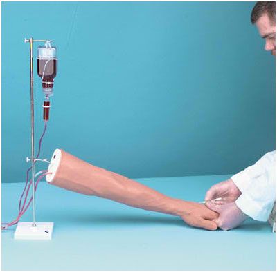 Ramię do nauki iniekcji to wysokiej jakości model, uwzględniający realistyczną, anatomiczną budowę ręki, pozwalający na wykonywanie iniekcji. Model wykonany jest z wysokiej jakości, łatwego do utrzymania w czystości materiału. Na modelu może być praktykowane nakłuwanie żył obwodowych w celu pobierania próbek krwi i umiejscowienia cewnika w żyle oraz wykonywanie iniekcji śródmięśniowej (bez użycia płynu ). I. Specyfikacja techniczna. Zestaw zawiera: • model ramienia, • stojak, • pojemnik na sztuczną krew, • strzykawkę, • opakowanie transportowe, • masa: 3.63 kg. II. Akcesoria/elementy zużywalne: Wymienna skóra. Proszek do sporządzania sztucznej krwi oraz zestaw do infuzji. Plastikowy pojemnik na sztuczną krew z wieszakiem. Ramię do nauki iniekcji : 1. Jest to łatwy w obsłudze, bezawaryjny fantom ramienia do nauki iniekcji. 2. Jest ekonomiczne - dzięki wymiennym żyłom oraz skórze, które mogą być wielokrotnie nakłuwane. 3. To sprawdzony fantom, łączący w sobie realizm i użyteczność z atrakcyjną ceną. 4. Dzięki rzeczywistemu odwzorowaniu skóry i żył modelu ćwiczenia przeprowadzane są niemalże jak w naturalnych warunkach.