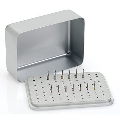 Aluminiowa podstawka na wiertła. Posiada zdejmowaną przykrywkę. Nadaje się do sterylizacji w autoklawach.