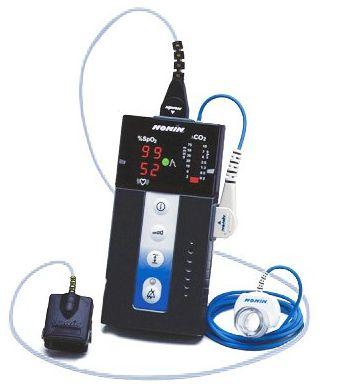 Pomiar stężenia dwutlenku węgla w wydychanym powietrzu jest funkcją szczególnie użyteczną przy monitorowaniu prawidłowości założenia rurki intubacyjnej. Zastosowana technologia pomiaru w strumieniu głównym nie wymaga kalibracji ani nagrzewania - urządzenie jest gotowe do przeprowadzenia pomiaru natychmiast po uruchomieniu. Zasilanie kompletem 6 baterii typu AA pozwala na minimum 20 godzin ciągłej pracy. Urządzenia posiadają dwa duże, czytelne wyświetlacze typu LED do odczytu mierzonej wartości SpO2 oraz pulsu a także wskaźnik słupkowy poziomu CO2. Trójkolorowy wskaźnik perfuzji dostarcza informacji o jakości sygnału pulsu i ułatwia podjęcie decyzji o ewentualnej konieczności zmiany położenia czujnika.