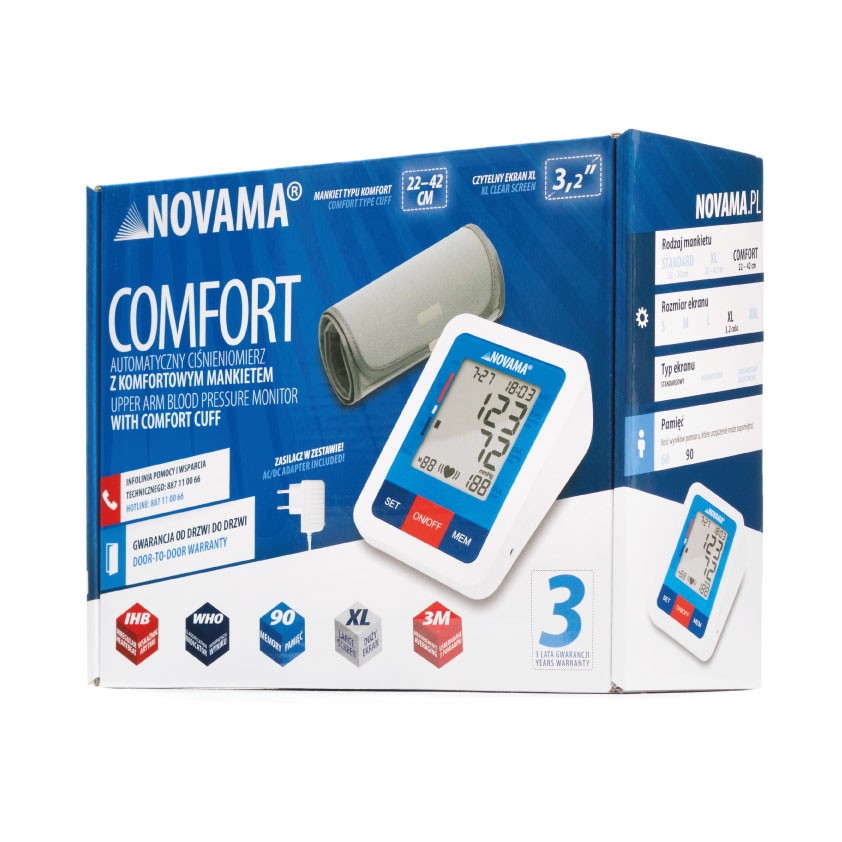 Ciśnieniomierz Novama Comfort to łatwy w obsłudze ciśnieniomierz automatyczny z mankietem typu komfort i dużym wyświetlaczem.Po naciśnięciu tylko jednego przycisku rozpoczyna się pomiar.