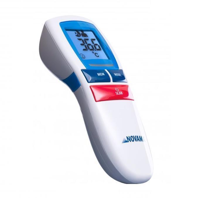 Termometr Novama Free to nowoczesny błyskawiczny termometr bezdotykowy. Posiada funkcję pomiaru w odległości od 0,5 do 3 cm z wyygodnym przymiarem na boku termometru. Natychmiastowy, pomiar poniżej 1 s. Termometr mierzy temperaturę ciała, obiektów, płynów, posiłków a także wody w kąpieli. Posiada duży, podświetlany ekran, pamięć 30 pomiarów, alarm gorączki oraz wskaźnik zużycia energii. Termometr Novama Free można przełączyć w tryb nocny, dzięki temu nie obudzimy śpiącego dziecka.