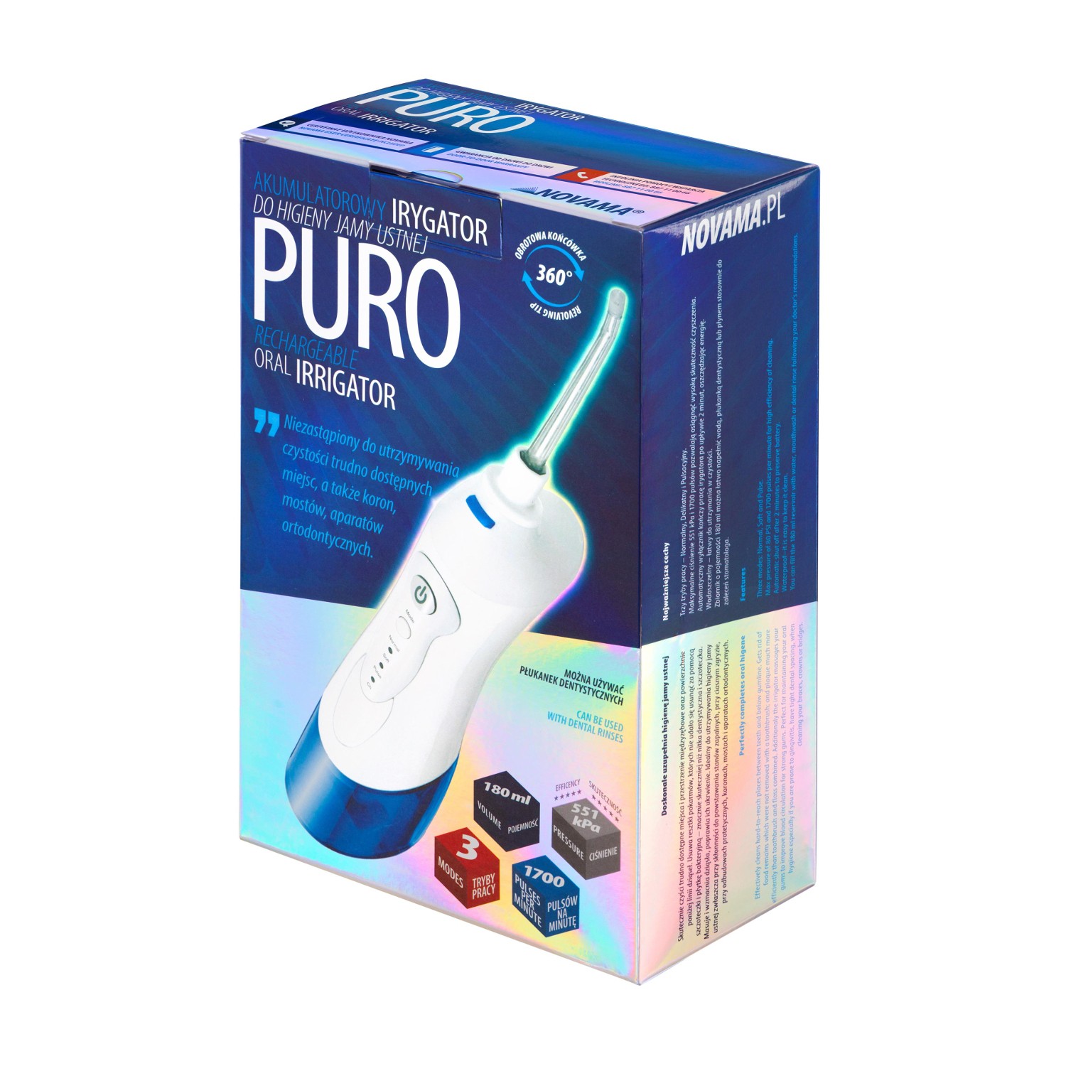 Irygator dentystyczny akumulatorowy Novama Puro ze zbiornikiem 180 ml, końcówka do irygatora, ładowarka, karta gwarancyjna, instrukcja obsługi w języku polskim.
