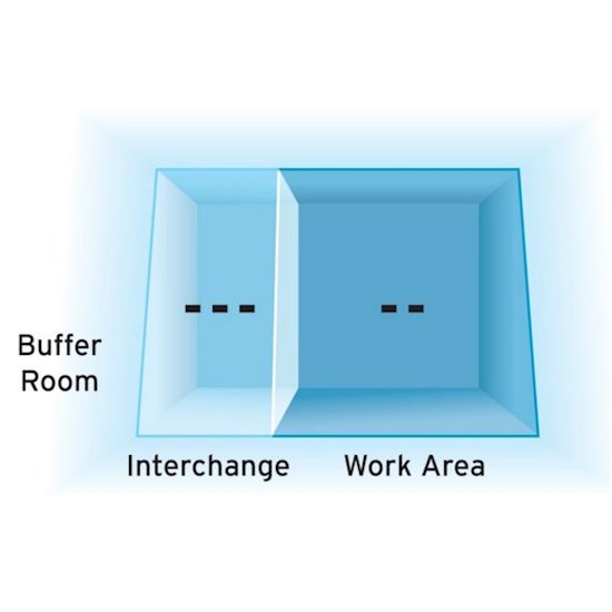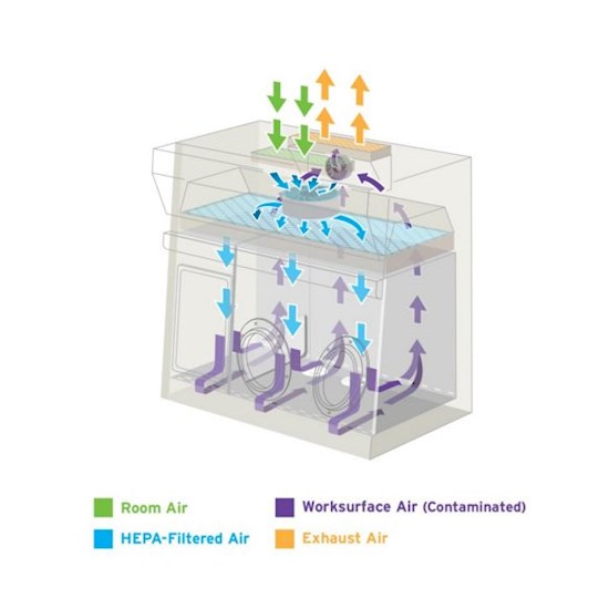 - ciśnienie negatywne, przepływ recyrkulowany minimalizujący możliwość wycieku materiałów niebezpiecznych poza strefę pracy,