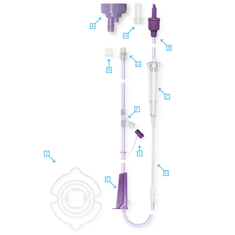 Flocare® Zestaw do pompy Flocare® 800, do butelek, to zestaw do żywienia dojelitowego z końcówką ENFit®, który służy do połączenia butelek z dietą i ze zgłębnikiem. Umożliwia żywienie pacjenta metodą ciągłego wlewu przy użyciu pompy do żywienia dojelitowego Flocare® 800.