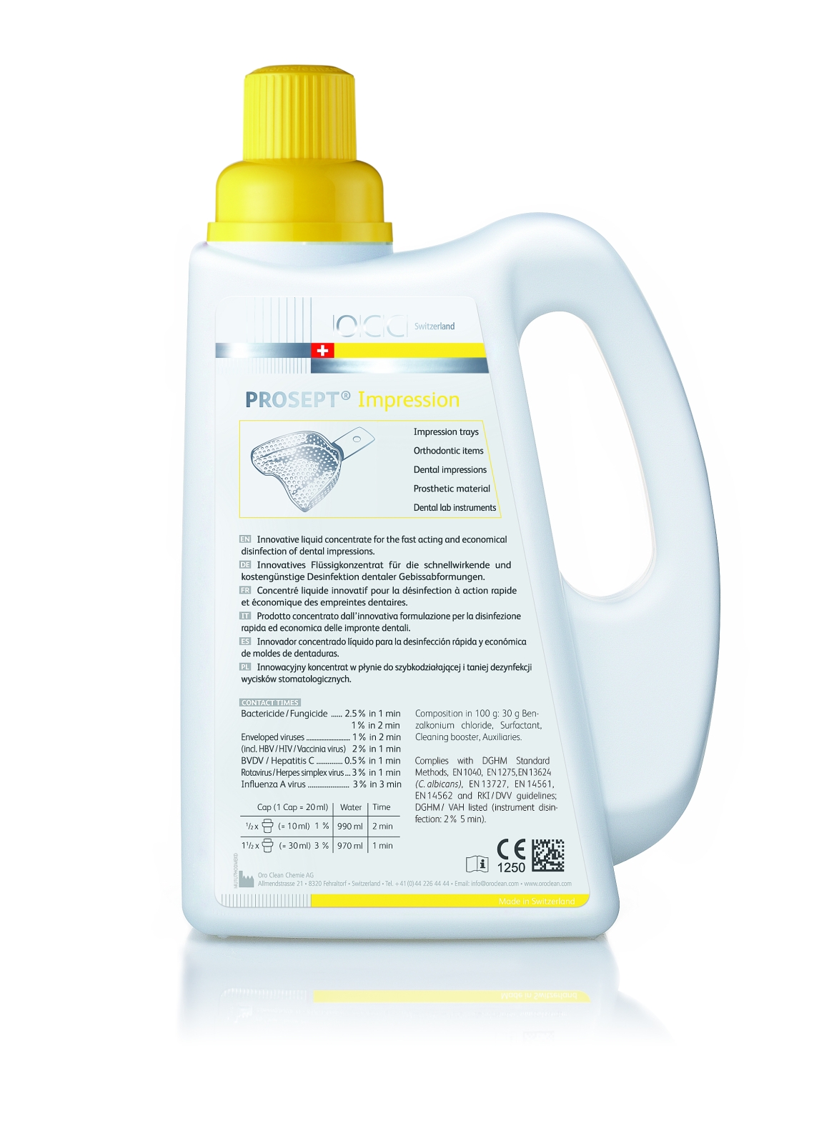 Koncentrat do dezynfekcji i czyszczenia wycisków uzębienia, aparatów ortodontycznych, półwyrobów techniki dentystycznej i materiałów protetycznych. Nie zawiera aldehydu. Dostępne opakowania: 150ml, 1L.